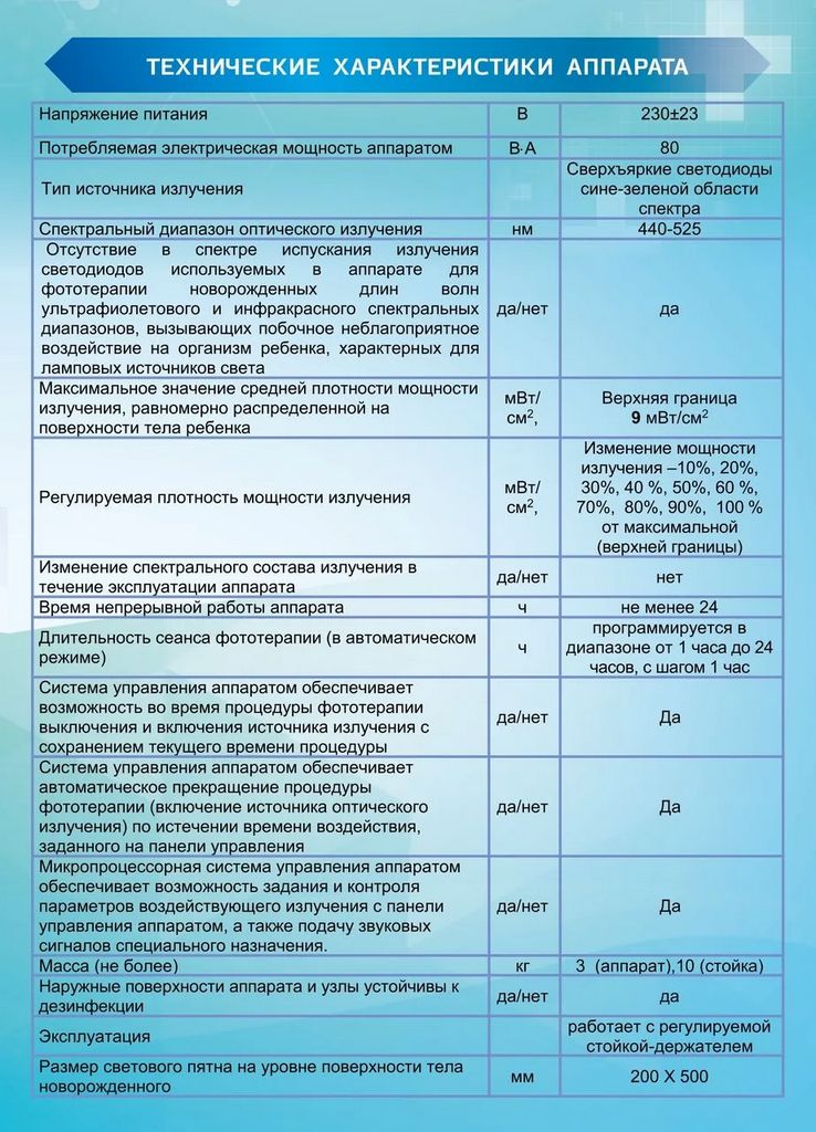 В качестве источников оптического излучения используются сверхъяркие светодиоды, с максимумами спектра излучения на длинах волн lформ = 476 нм и lформ = 505 нм в определенном соотношении интенсивностей. Верхняя граница плотности мощности светового потока на уровне поверхности тела новорожденного составляет 9 мВт/см2. Плотность мощности излучения регулируемая - 10%, 20%, 30%, 40%, 50%, 60%, 70%, 80%, 90%, 100% от максимальной (верхней границы).